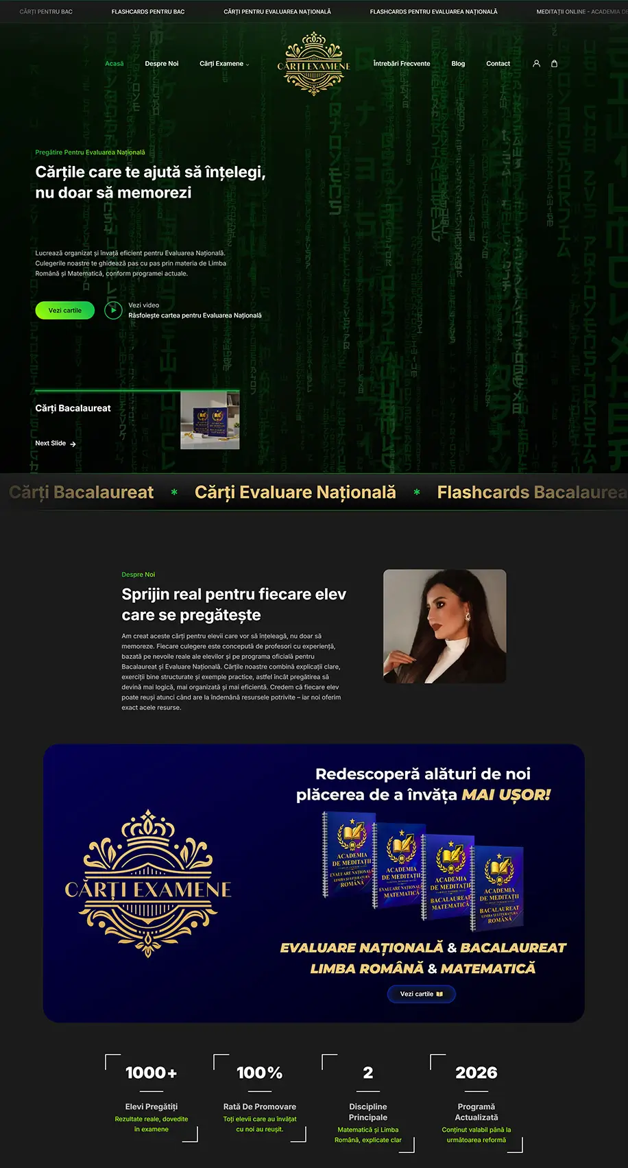 Carti Examene es una tienda en línea creada en Rumanía para los estudiantes que se preparan para los exámenes escolares más importantes. El proyecto fue desarrollado por el equipo de la Academia de Meditatii, como una extensión de su experiencia trabajando directamente con alumnos y profesores de todo el país.
